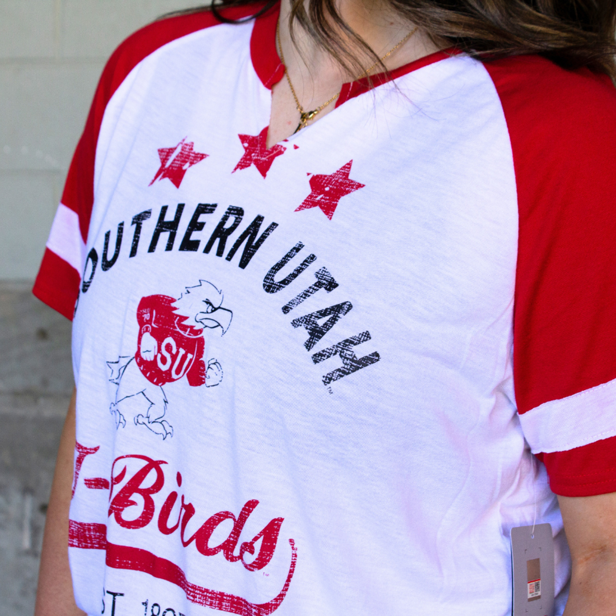 65% Polyester 35% Rayon Screen Print Decoration Slight V Neckline Sewn Stripe on Sleeve Womens Sizing